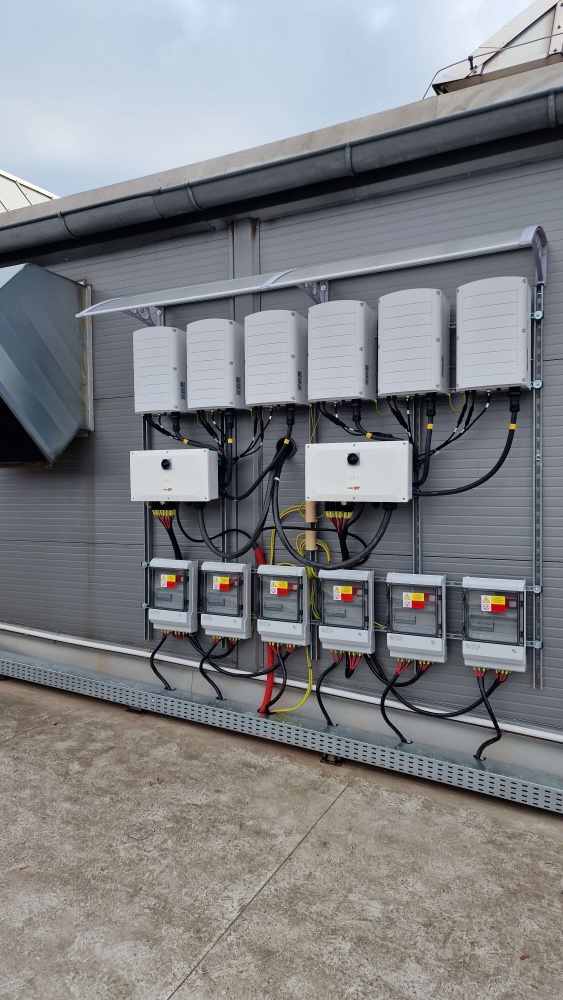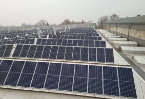 • Fotovoltaický systém o celkovém výkonu 450 kWp je instalován na speciálmí konstrukci, uchycené k rámům světlíků. Každý panel je osazen výkonovým optimizérem, což umožňuje výrobně pracovat při nejvyšší možné efektivitě.