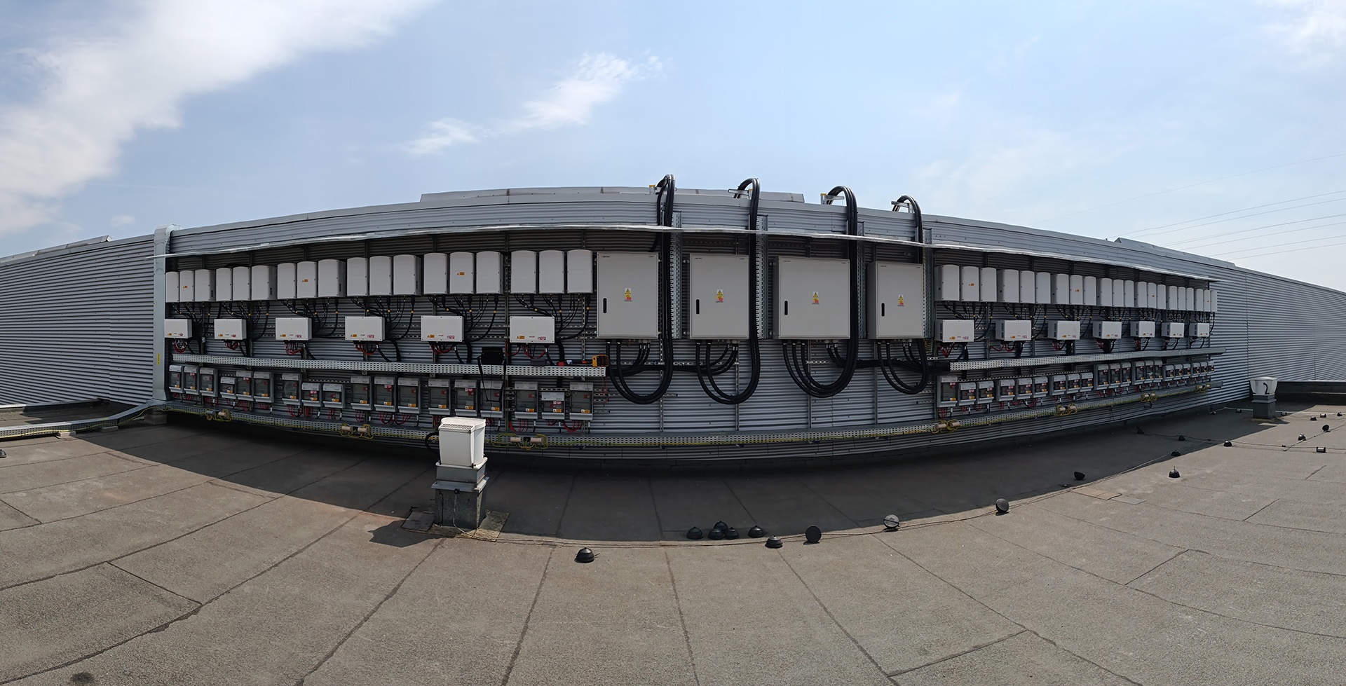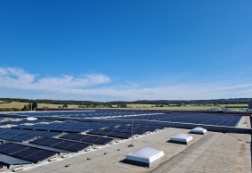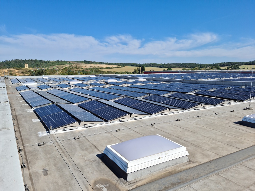 • Fotovoltaická elektrána o celkovém výkonu 546 kWp je instalována na střeše centrálního skladu provozovatele obchodního řetězce. Panely jsou instalovány na samozátěžové konstrukci s orientací východ - západ.