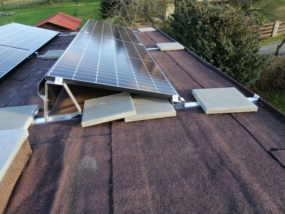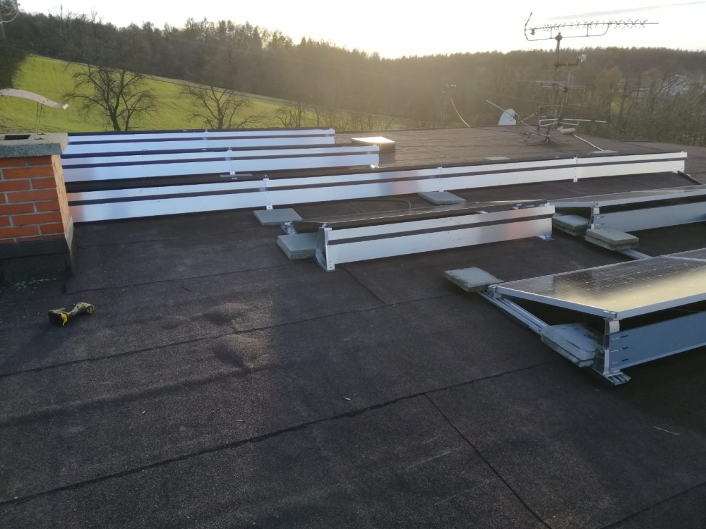 Podle přání zákazníka na maximální výkon FVE byla provedena montáž FV panelů na 2 samostatné střechy (RD a garáž) – propojení stringů a umístění technologie bylo realizováno v RD