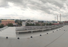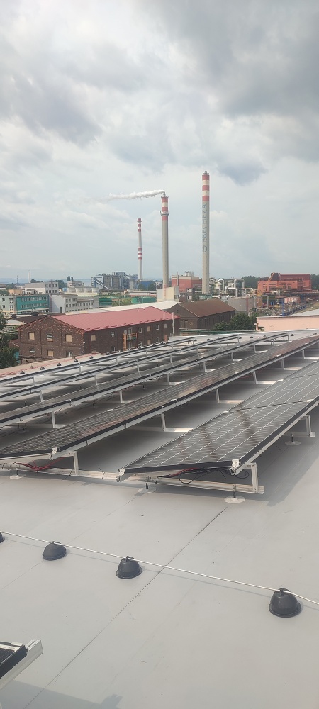 • Celkový výkon FVE je 40,04 kWp s připojením k LDS, 88 ks fotovoltaických panelů o výkonu 455 Wp, střídač Growatt 3x SPH 10 kW + baterie 18 ks 2,56 kWh tj. celkem 46,08 kWh. Hlavní části celého systému jsou FV panely, které jsou připevněny k samonosné konstrukci s orientaci jiho-východ 22° kotvené pod uhlem 10°. Konstrukce na střeše je provedena s ohledem na zajištění mechanické stability zejména proti působení větru.