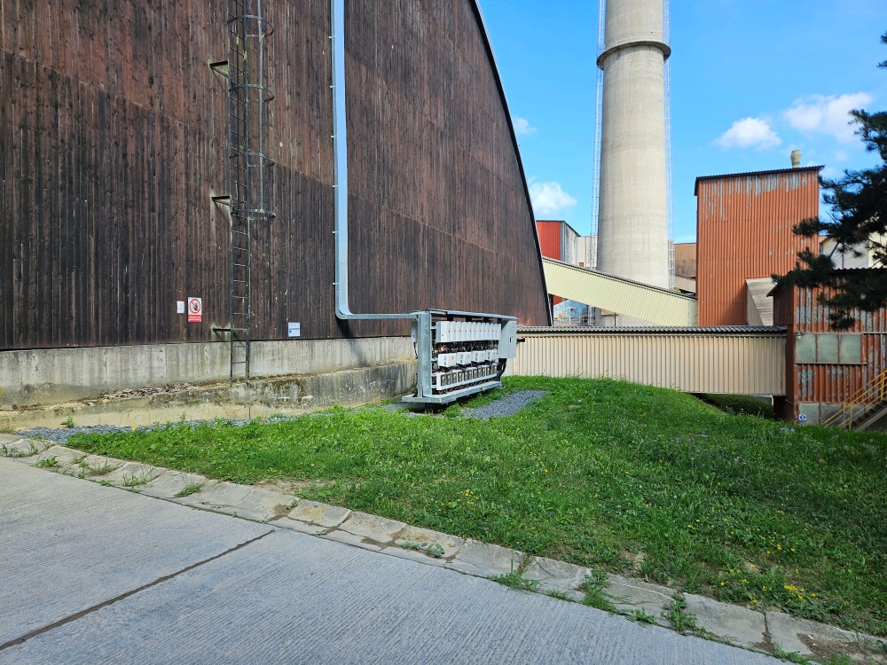 • Fotovoltaický systém je instalován obloukové střeše skladovací haly. Panely jsou umístěny na speciální kotvené konstrukci, kdy na jižní části fotovoltaické panely kopírují sklon střešní roviny a na severní části směřují na východ - západ. Součástí plnění je rovněž dodávka nové hromosvodové soustavy, provedené izolovanými vysokonapěťovými vodiči.