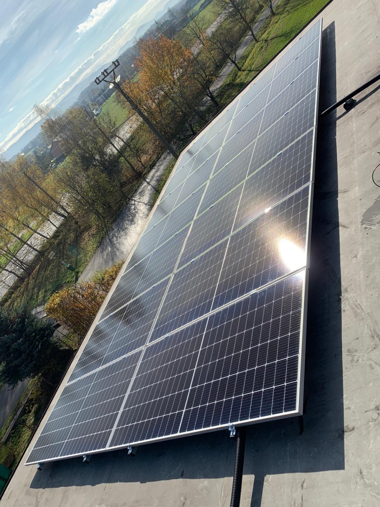 • Zde instalace FVE na mírnou sedlovou střechou s PVC krytinou – důraz kladen na perfektní utěsnění kotevních bodů