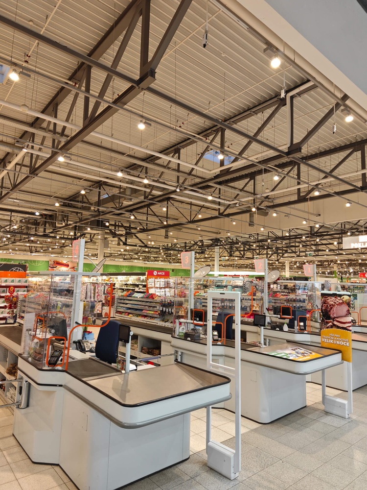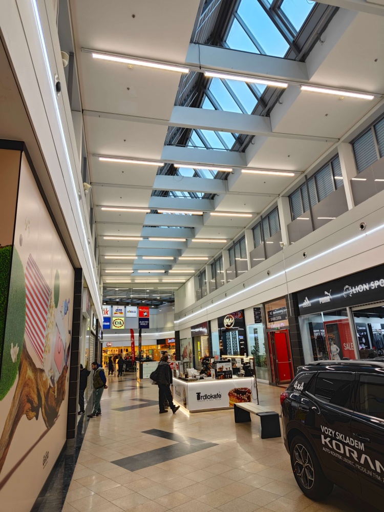 • Požadavkem investora byla jednoznačná úspora nákladů na osvětlení nákupního centra v pasážích a zázemí. Byl vytvořen projekt osvětlení včetně světelně technických výpočtů. Na základě toho proběhla kompletní výměna starého osětlení za nové moderní led úsporné osvětlení. Součástí toho bylo také nahrazení venkovního osvětlení a to pomocí úsporného led osvětlení BUBU.